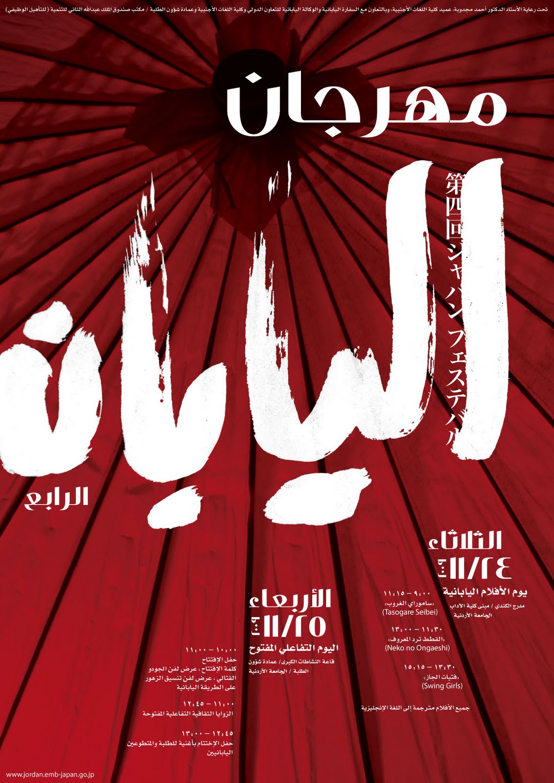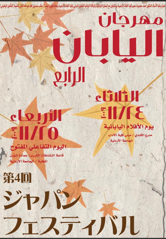 The Embassy of Japan in Jordan in cooperation with the Faculty of Foreign Languages at the University of Jordan (UJ), the Japan International Cooperation Agency (JICA), and the Office of King Abdullah II Fund for Development and Career Counseling at the UJ organized the fourth Japan Festival on 24 and 25 November 2009 at the campus of the University of Jordan.